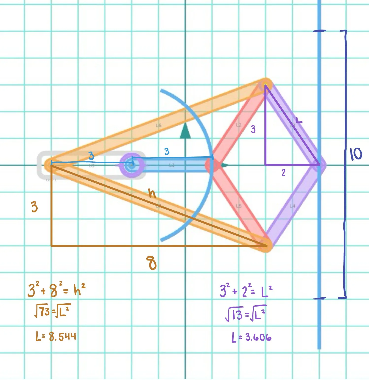 After a bit of online research, we decided on a Peaucellier–Lipkin linkage. We used MotionGen to get to know the linkage system better and play around with dimensions.
